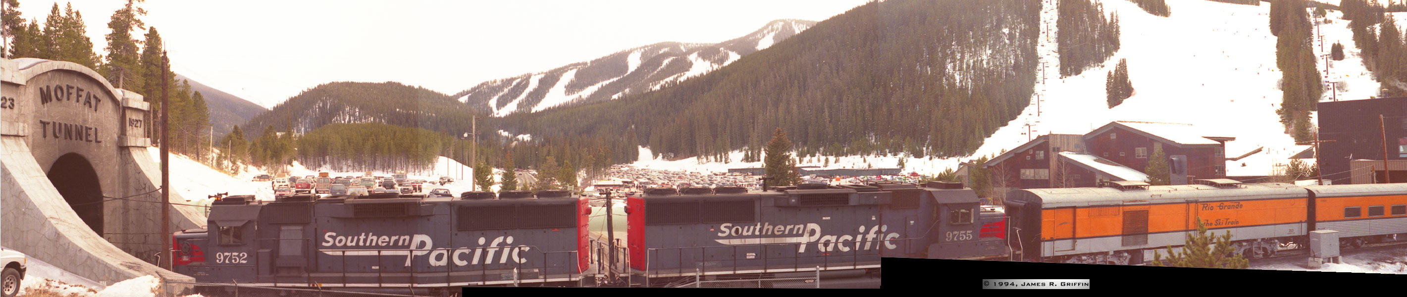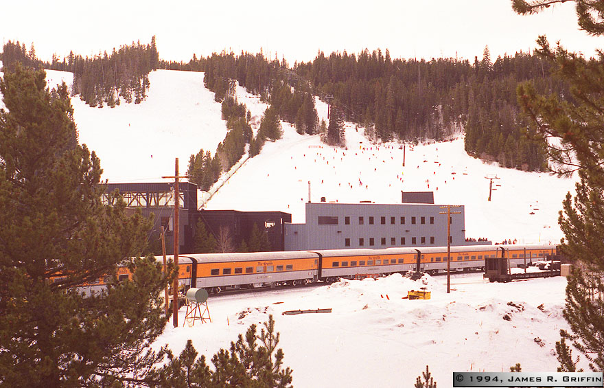 Here’s a composite panorama of the train and the resort, waiting to load passengers for the return trip on 12/29/1994. Southern Pacific GP60s 9752 and 9755 did the honors that day. This image expands to very large size.