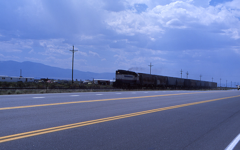 We just happened to be passing through Alamosa on opening day for the SLRG, July 2nd, 2003. The first day on the job had its share of headaches, evidently, since the locals hadn’t departed by noon. I managed a few shots downtown, and again of the Monte Vista local as it returned.