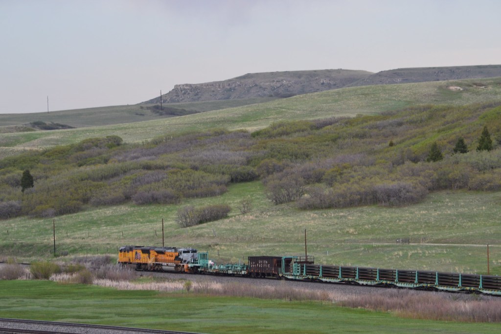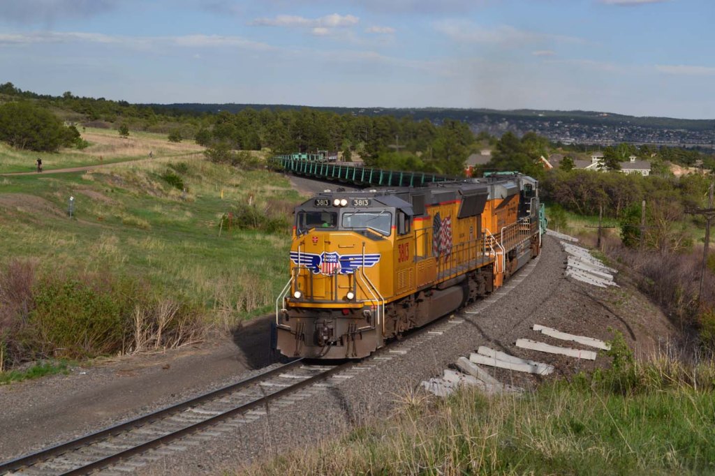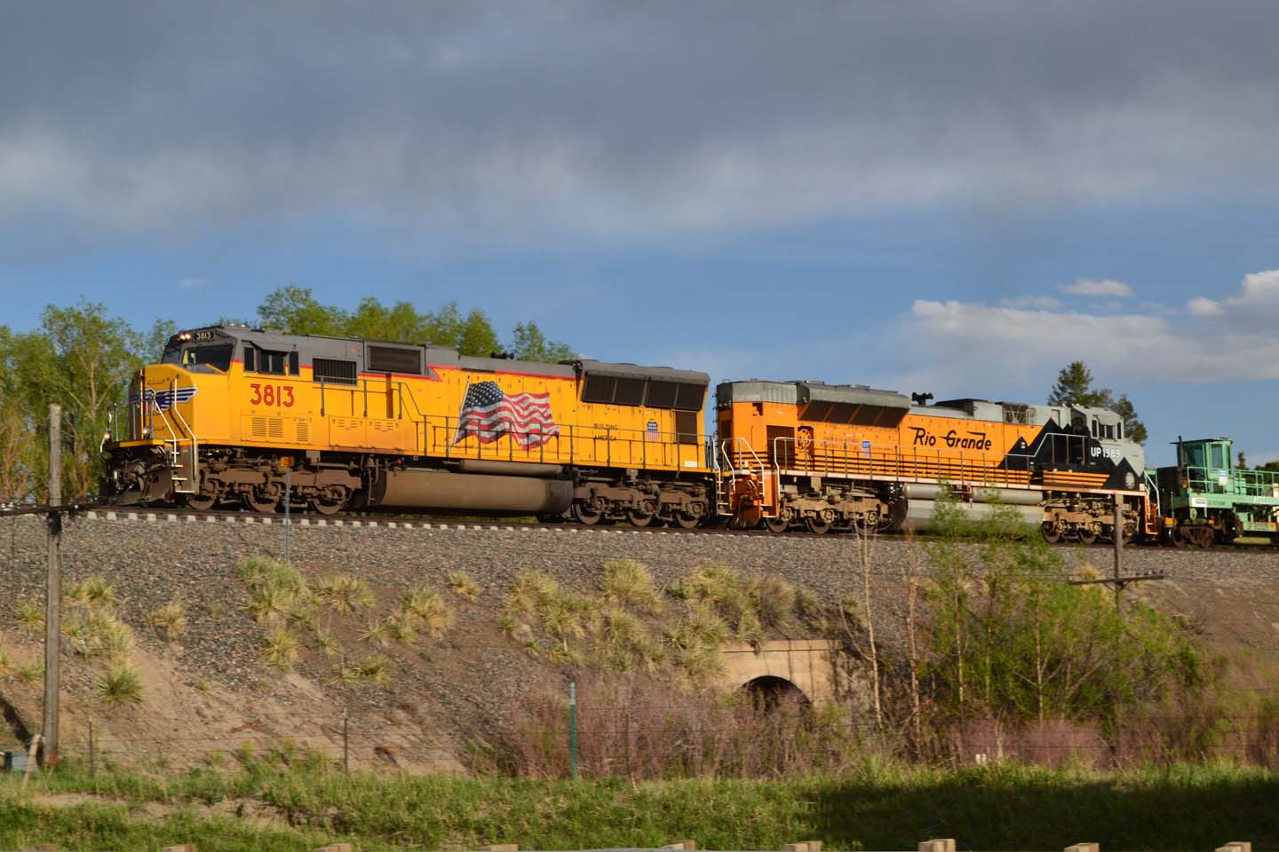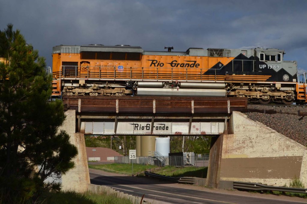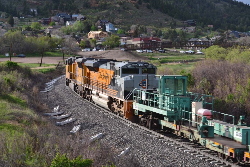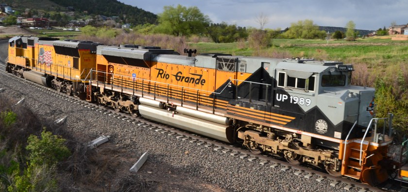 A family member’s relocation to the Front Range happily coincided with a brief assignment of this unit to the Pueblo pool. On the evening of May 23, 2020, I glanced out the window at the sound of a passing train, and Lo and Behold! There she was, running second on a northbound rail train. Not as picturesque as leading, but who knew when another chance to see it would arise. Half a loaf… I decided that I would never forgive myself if I didn’t give chase.