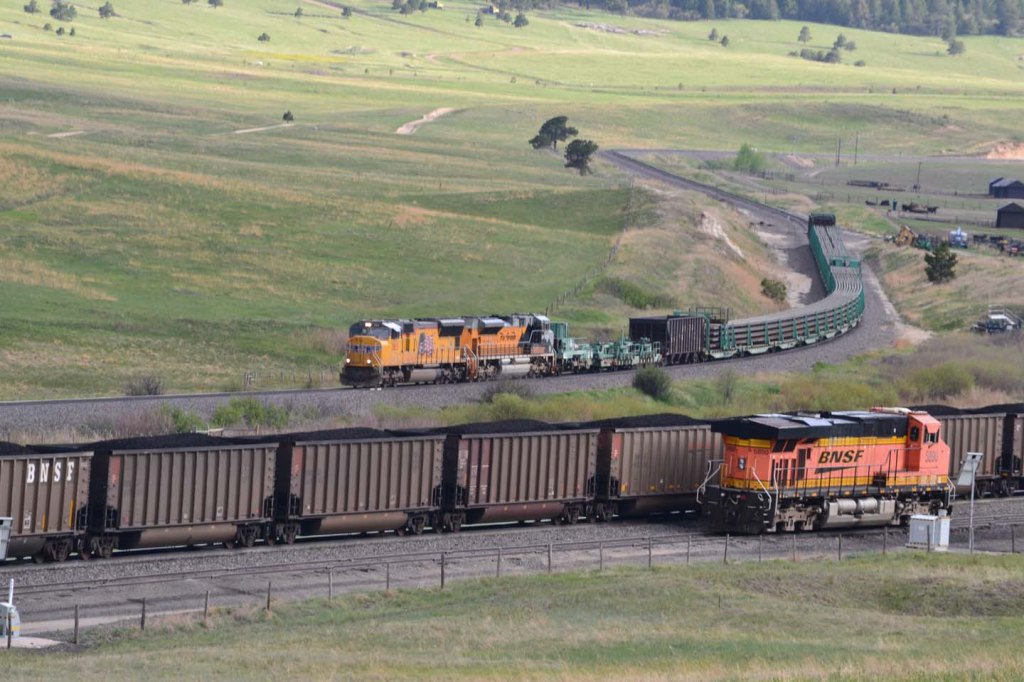 Again it was time to jump behind the wheel, as the train started making speed across the top of the ridge. I managed to get out ahead of it again and parked on the high ground at Spruce. There was a southbound BNSF coal train on the near track, waiting for the rail train to clear the single-track at Palmer. It sat and waited as my quarry hustled by on the northbound main.