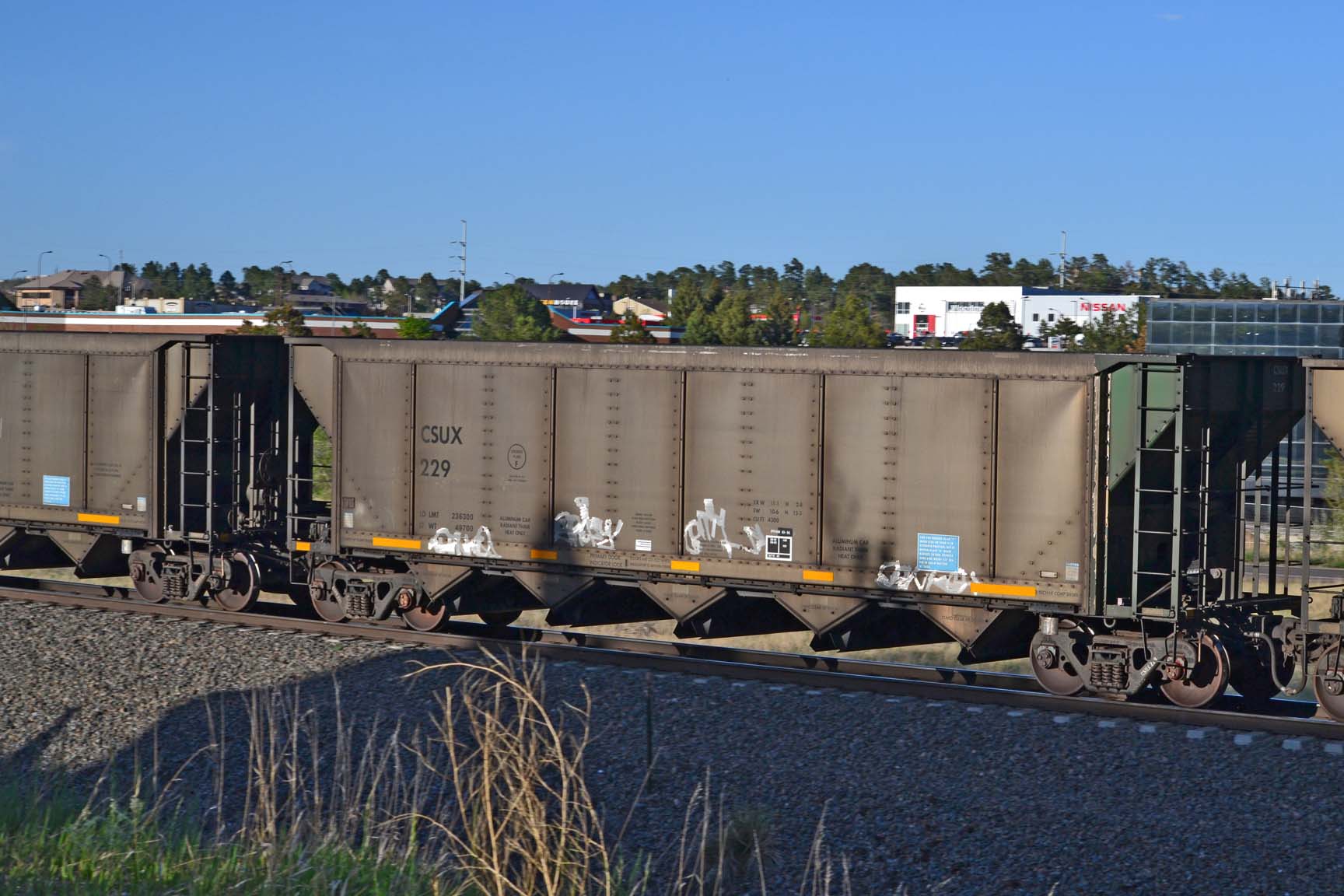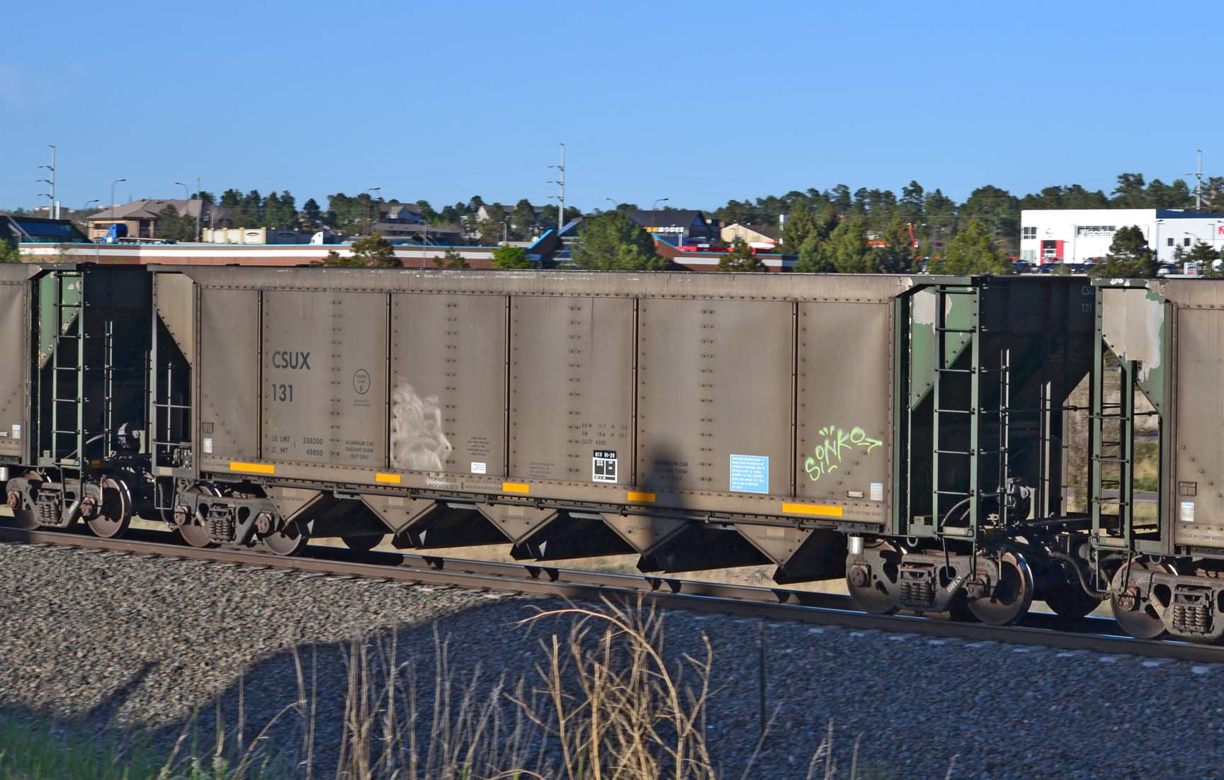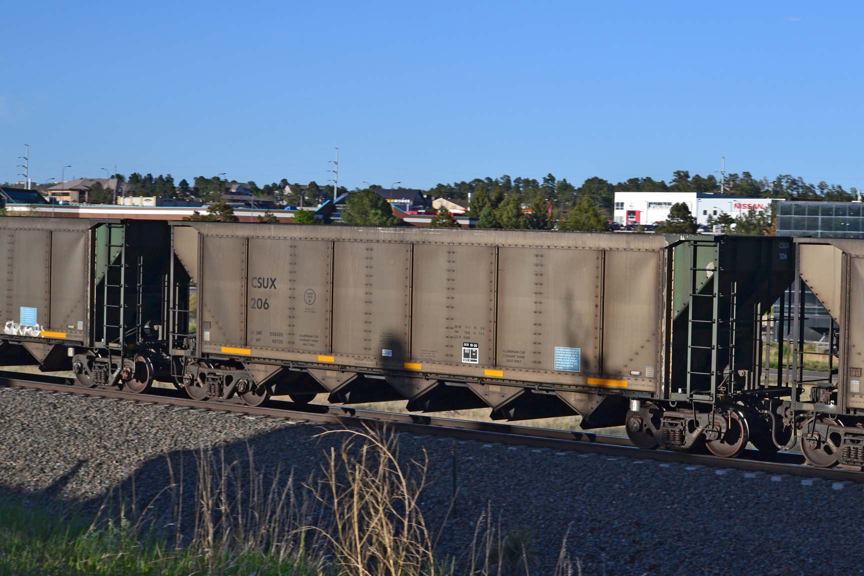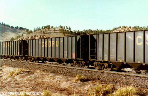 First up is the CSUX train. The owner, the C.S.D.P.U. at the time, ordered 85 cars from Ortner in 1979. These were 5-bay rapid discharge open hoppers, with a capacity around 110 tons. They were numbered 79000-79084. Each car had large CSPDU letters on the side, bracketed with a pair of lightning bolts. The train typically ran with about 73 cars, so there were 12 spares to protect the train.