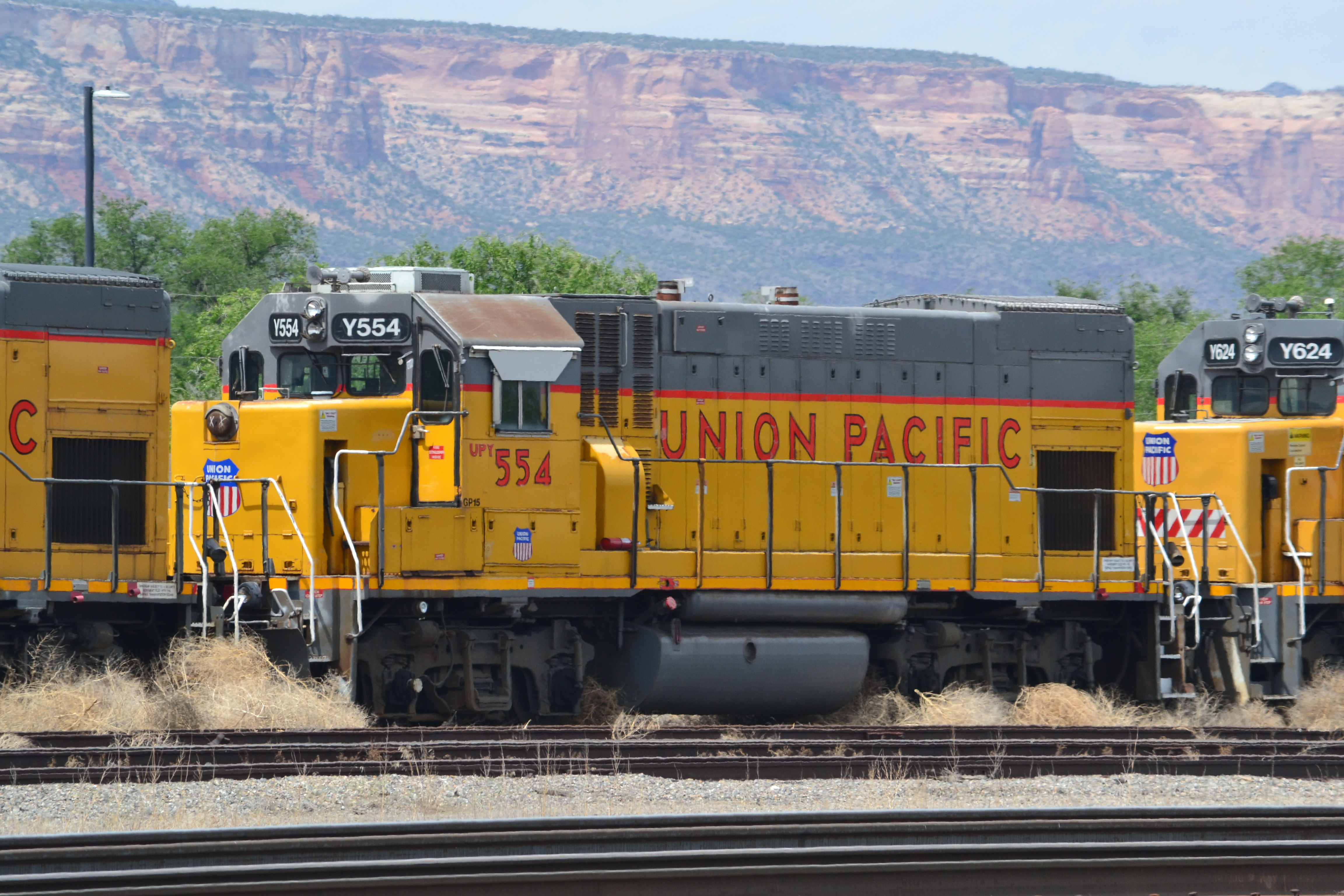 UPY 554, a GP15-1. For a while around 2017, UP stored a couple dozen such units in Grand Junction, Colorado. No. 554 is a representative of these. Whatever their situation, the cliffs of the Uncompaghre Uplift provide a stunning backdrop… |