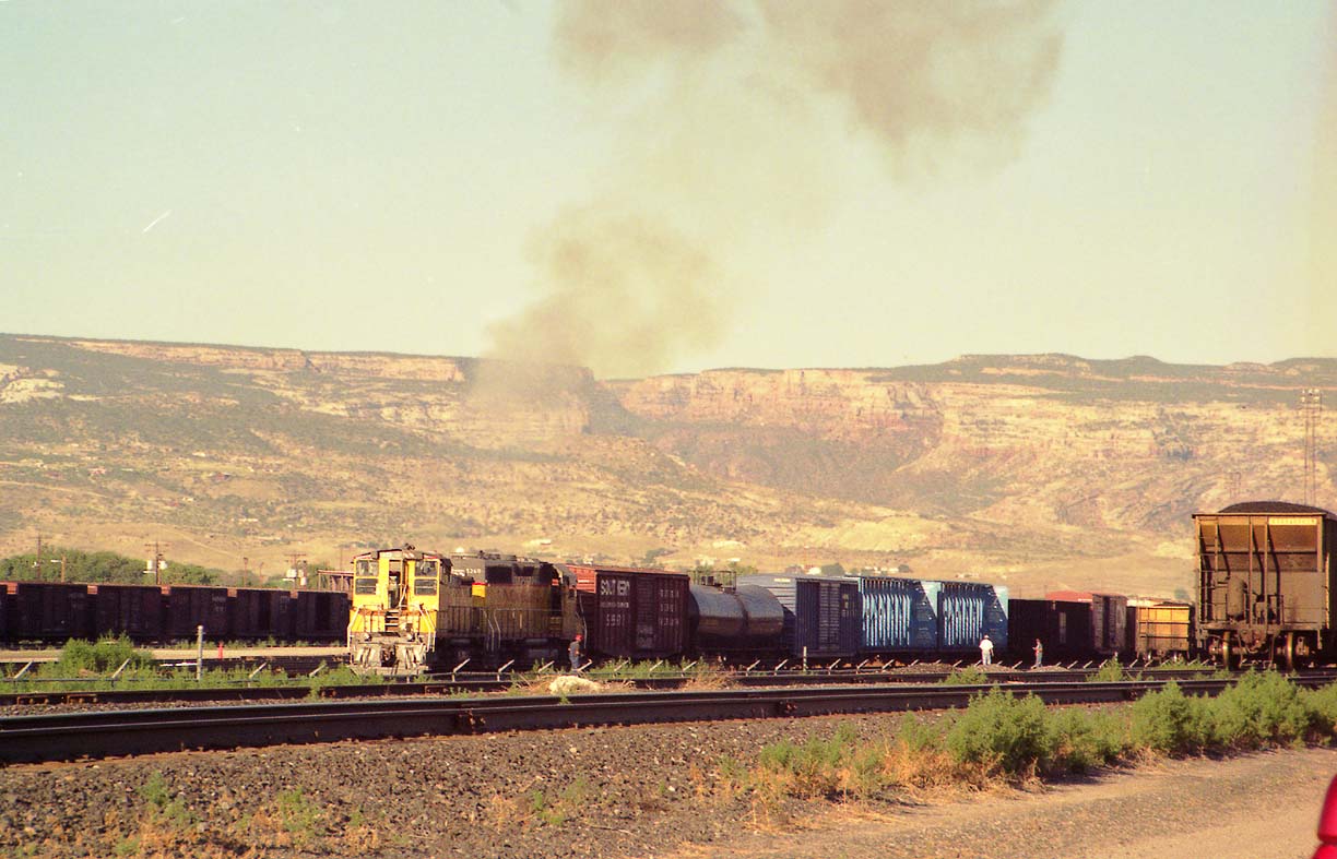 An SW-1500 and a GP40-2 (No. 5260) are switching in Grand Junction in August 1998. Not sure about the SW’s number, but the 5260 is the former D&RGW No. 3106. |
