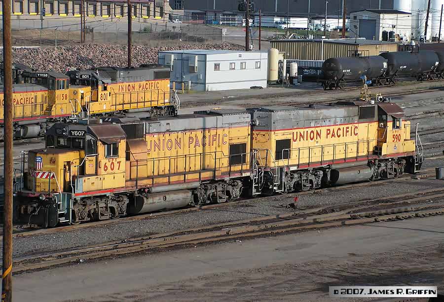 A pair of GP15-1’s of Missouri Pacific heritage are switching in Denver North Yard on July 29, 2007. No. 590 was MP 1590, went through repainting and renumbering and ended up as a UPY unit in May 2003. UPY 607 was MP 1607 and has been in the current number since July 2001. See here for more details. |