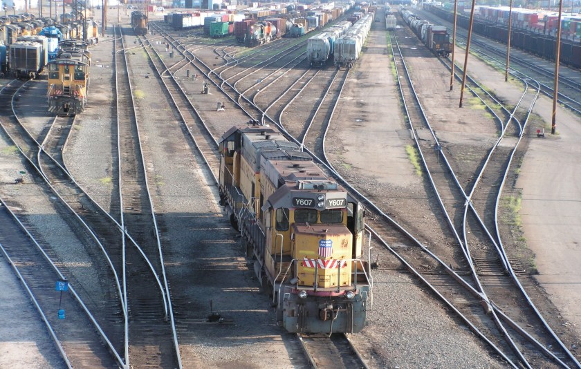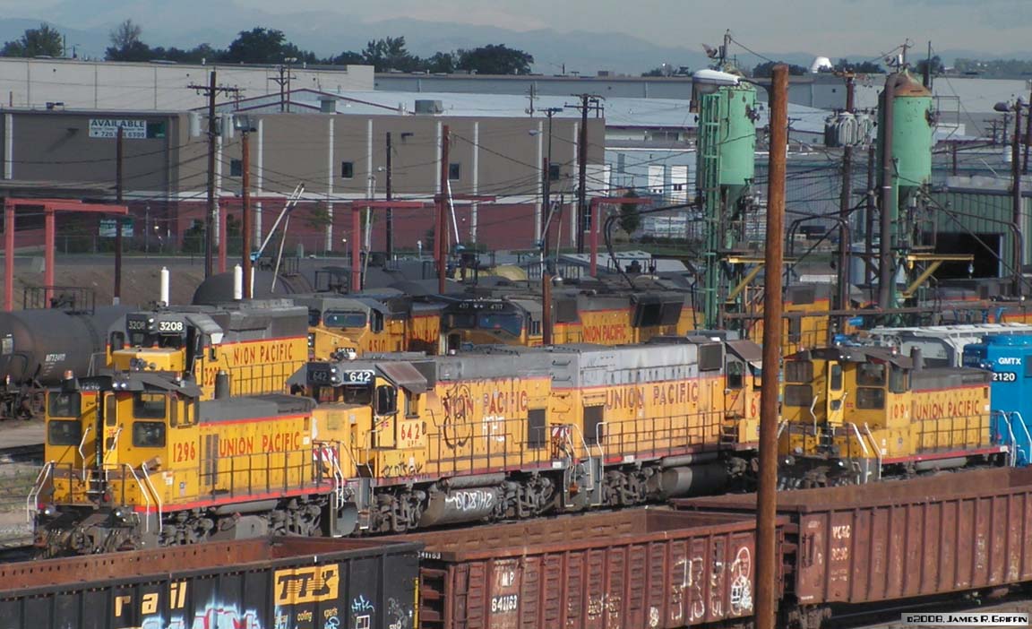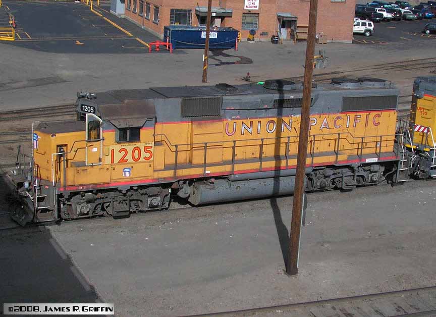 UP 1205 is a GP39-2 from the MKT. Here it’s switching in Denver’s North Yard on 91/2008. Her paint is getting a bit tattered. |