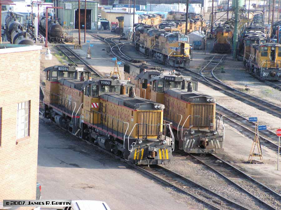 Two pairs of remote-control yard locomotives, seen at North Yard on 7/29/2007. The two southernmost units are UPY1150 and UPY1158, both SW1500’s of SP heritage– nee SP 2572 and SSW 2585, respectively. Back left is UPY 1002, originally SP 2555, retired in 1995 and recently refurbished for UP by Helm. Back right is GP38-2 No. 801, originally MP 2301 (SEE ABOVE). The lack of dynamic brakes is a good clue to the unit’s heritage. In this shot, it appears that the two closest locos are the controlling units, and the back two are simply MU’d to them for extra traction. |