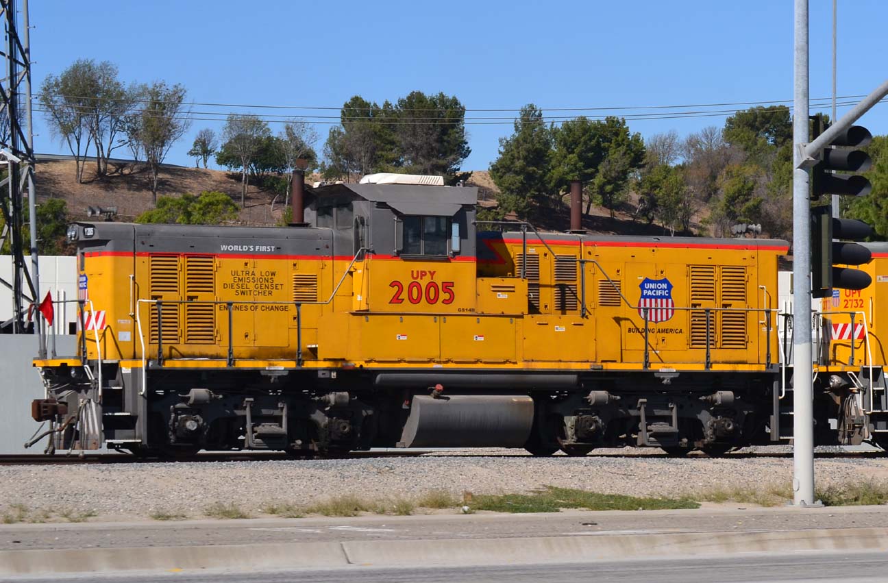 UPY 2005 is a rebuilt, ultra-low-emissions switcher designated as a 2GS14B (two gensets, 1,400 HP, B trucks). It is the only one built with a center cab. Here it’s near the LA intermodal yard on 10/30/2015. |