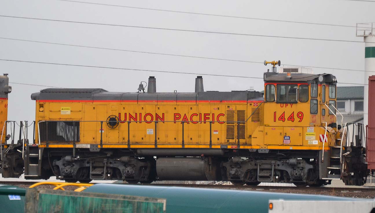 UPY 1449 is an MP15AC, formerly SP 2720, built September 1975 and renumbered as shown here in June 2000. Here it’s switching on a spur off Denver’s Belt Line along 58th St. (12/17/2014) |