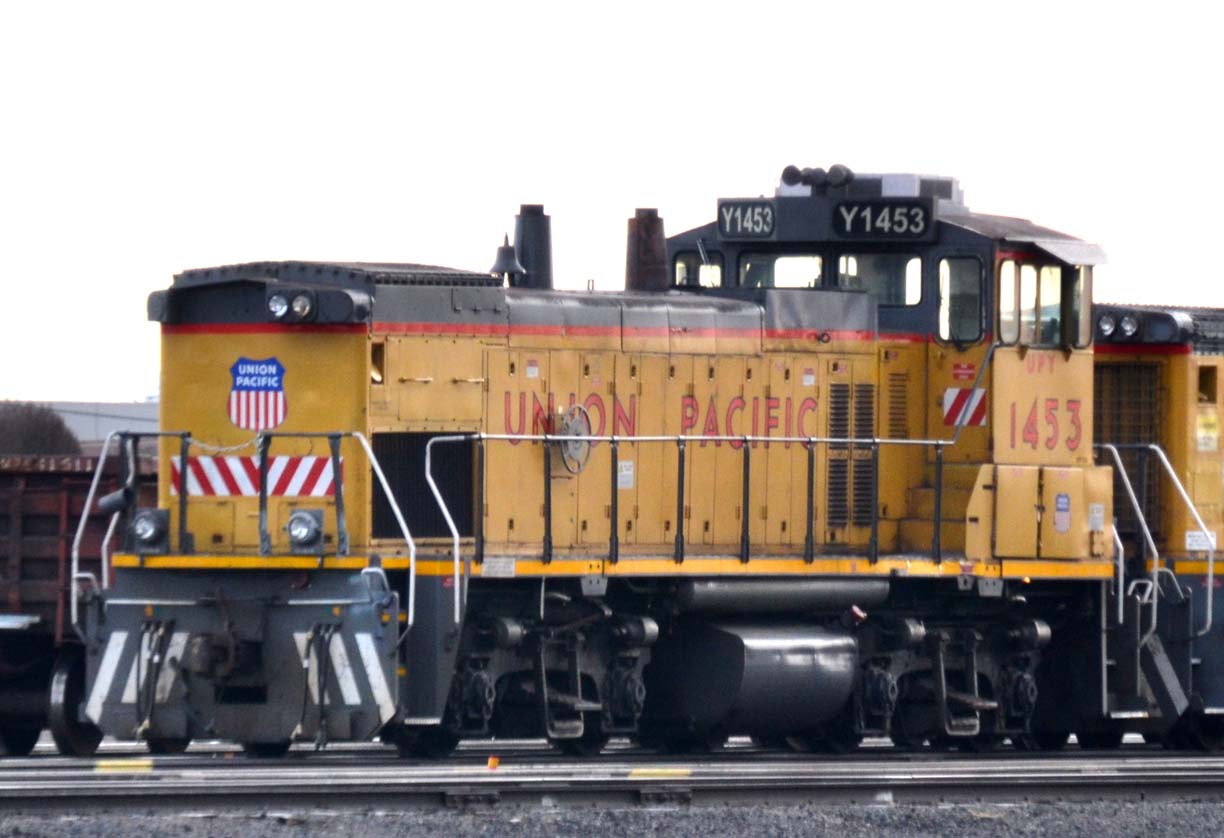UPY 1453 is an MP15AC, formerly SP 2725, built September 1975 and renumbered by UP in November 2003. Here it’s parked in Denver’s former DRGW North Yard near the Cargill elevator. (12/16/2014) |
