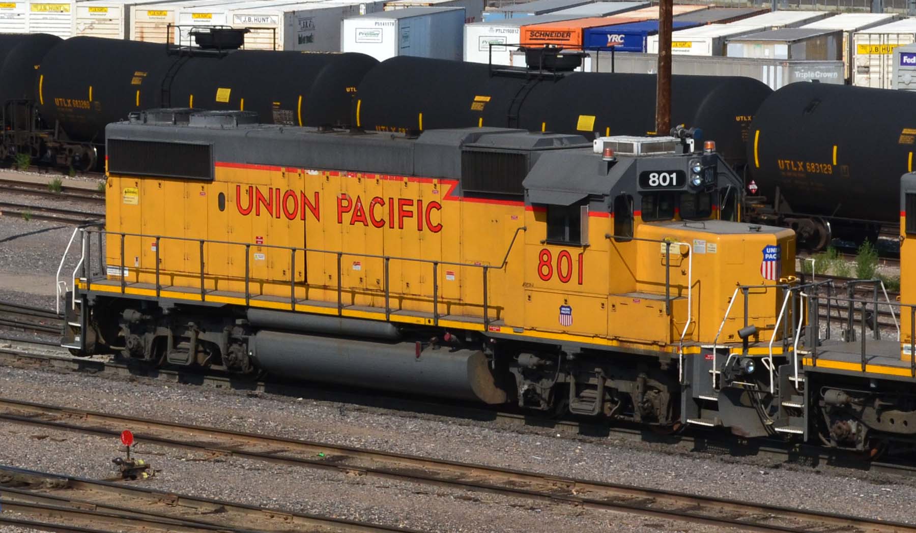 UP 801, a GP38-2, switching in Denver on 9/04/2021. NEW IMAGE