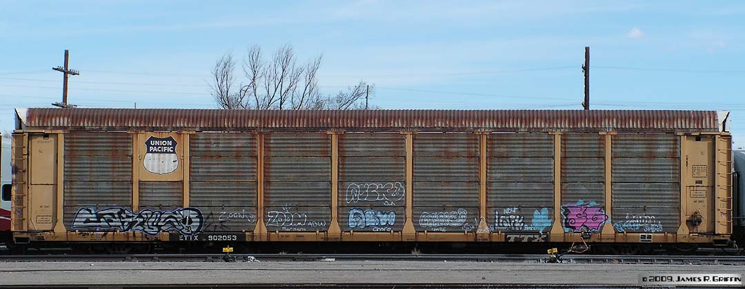 Tri-level repainted SP rack No. 517477. It’s seen at Albuquerque on 2/26/2009. Union Pacific periodically paints cars like this, to preserve their ownership of legacy reporting marks. Many SP system autoracks were permanently mated with flats with the same number, i.e. were considered a single piece of equipment.