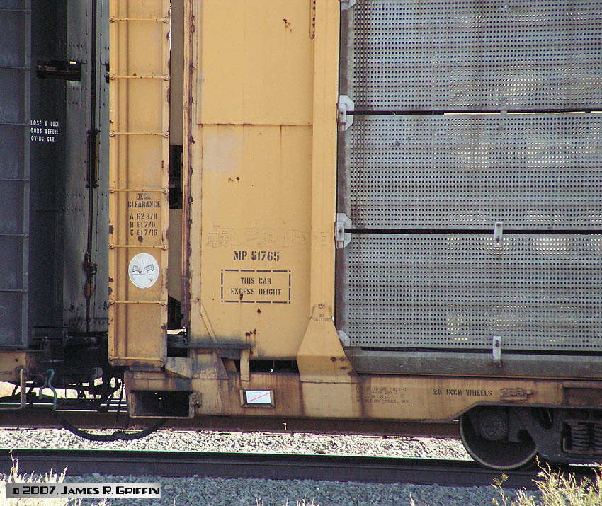 A tri-level rack with marks MP 51765, on flatcar ETTX 820424 (Rincon, NM, 11/04/2007). Here’s a close-up of the rack markings. A lot of racks carry Missouri Pacific reporting marks. |