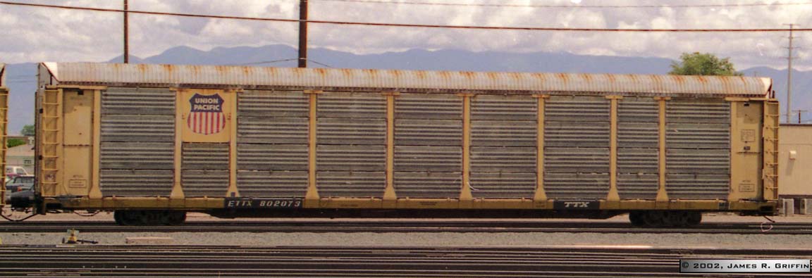 Tri-level UP auto rack, on ETTX flat 802073, passing through Belen in July 2002. |