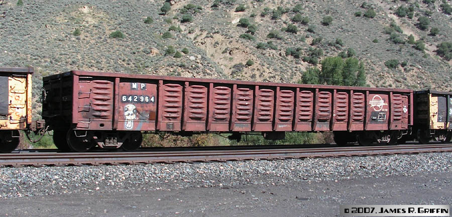 Missouri Pacific gon No. 642964, still wearing the MoPac eagle herald, at Hot Sulphur Springs, CO on 8/09/2007. An ex-RailGon gondola, now CNW, is to its right. |