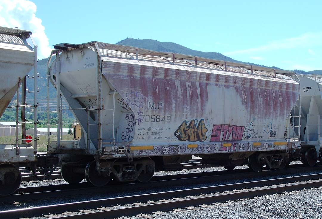 Missouri Pacific 2-bay covered hopper (ACF) 705649, at Glenwood Springs on 7/29/2011. Original paint and much-graffitied. |