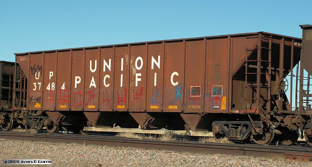100-ton quad hopper 37484, at Alamosa (12/28/2009). The graffiti makes it hard to be sure, but it seems to have been built in August 1974. |