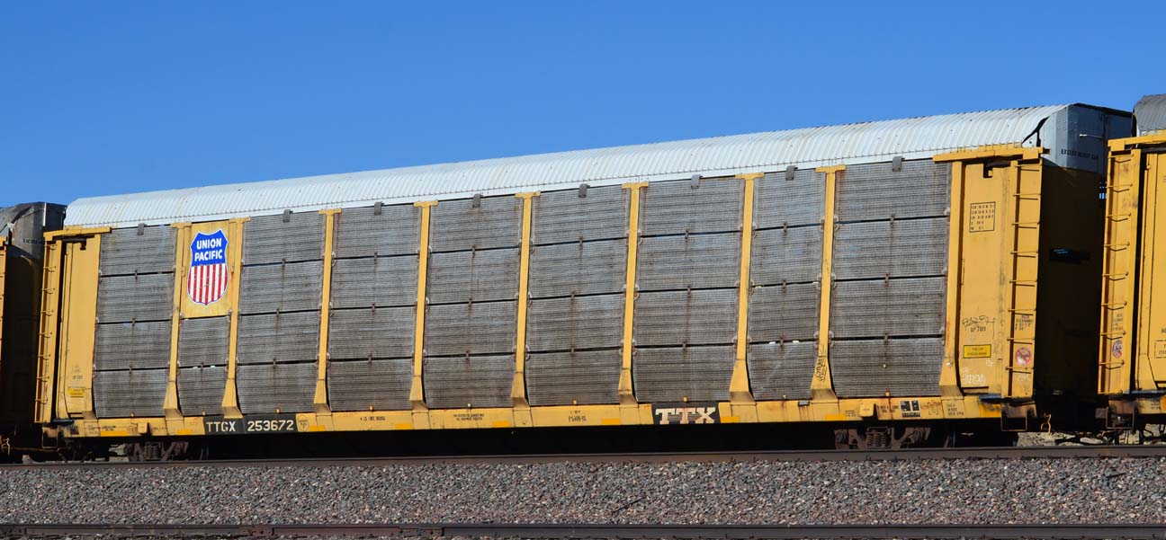 Bi-level rack UP 7819, on TTGX 253672 (entering Gallup, NM, 12/27/2017) |