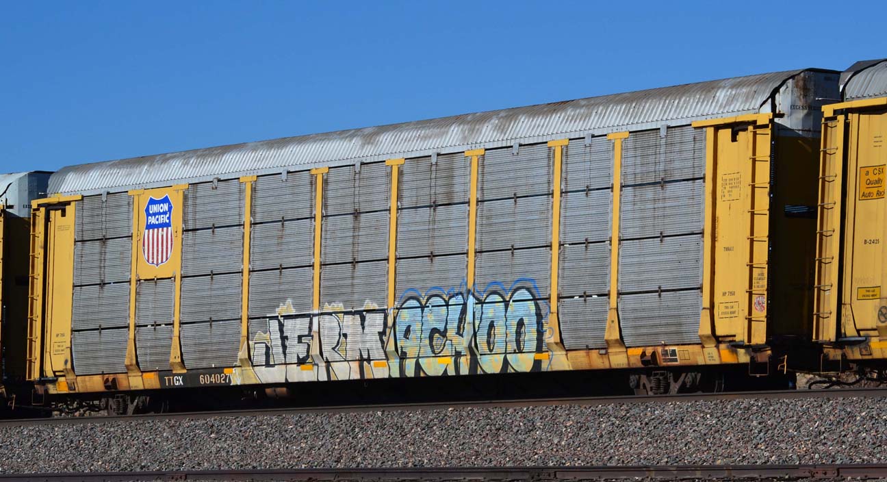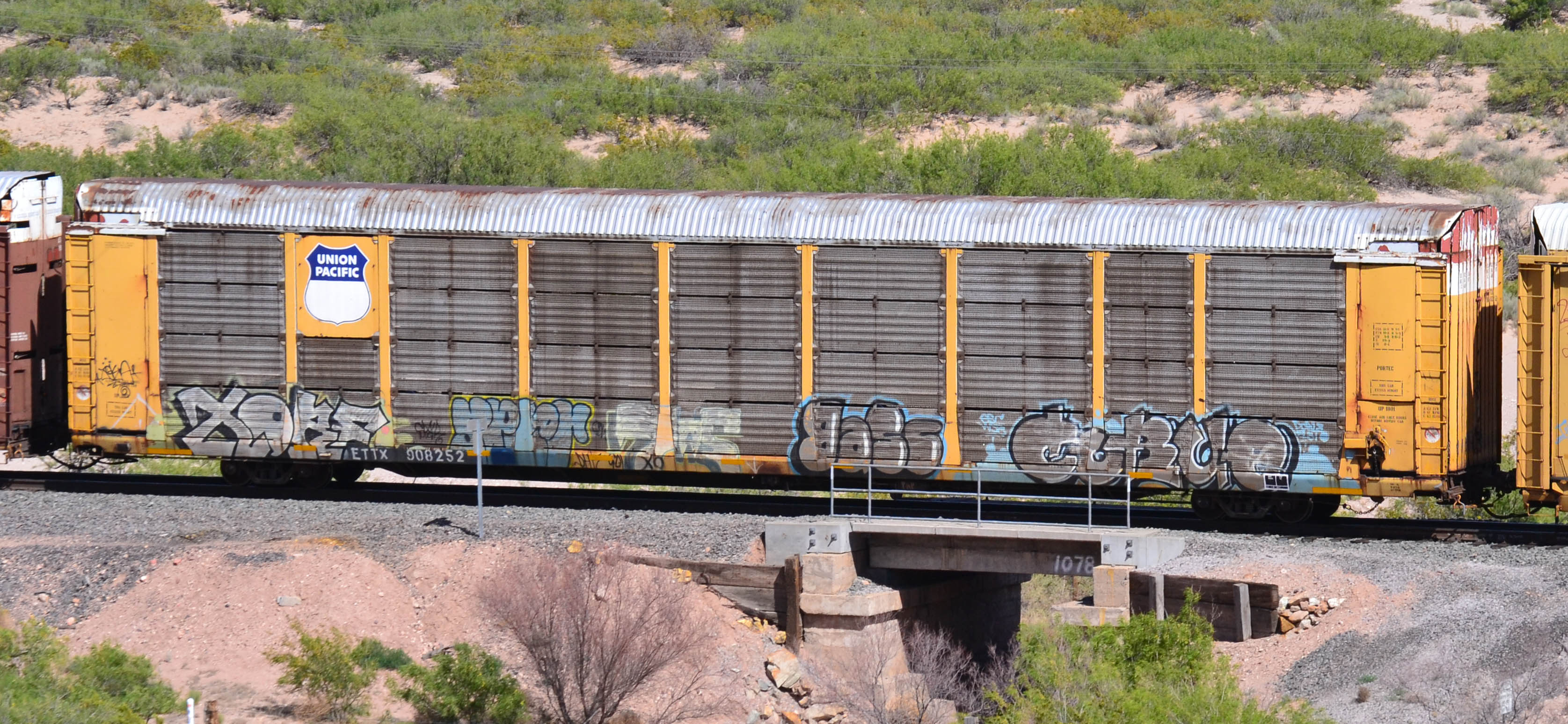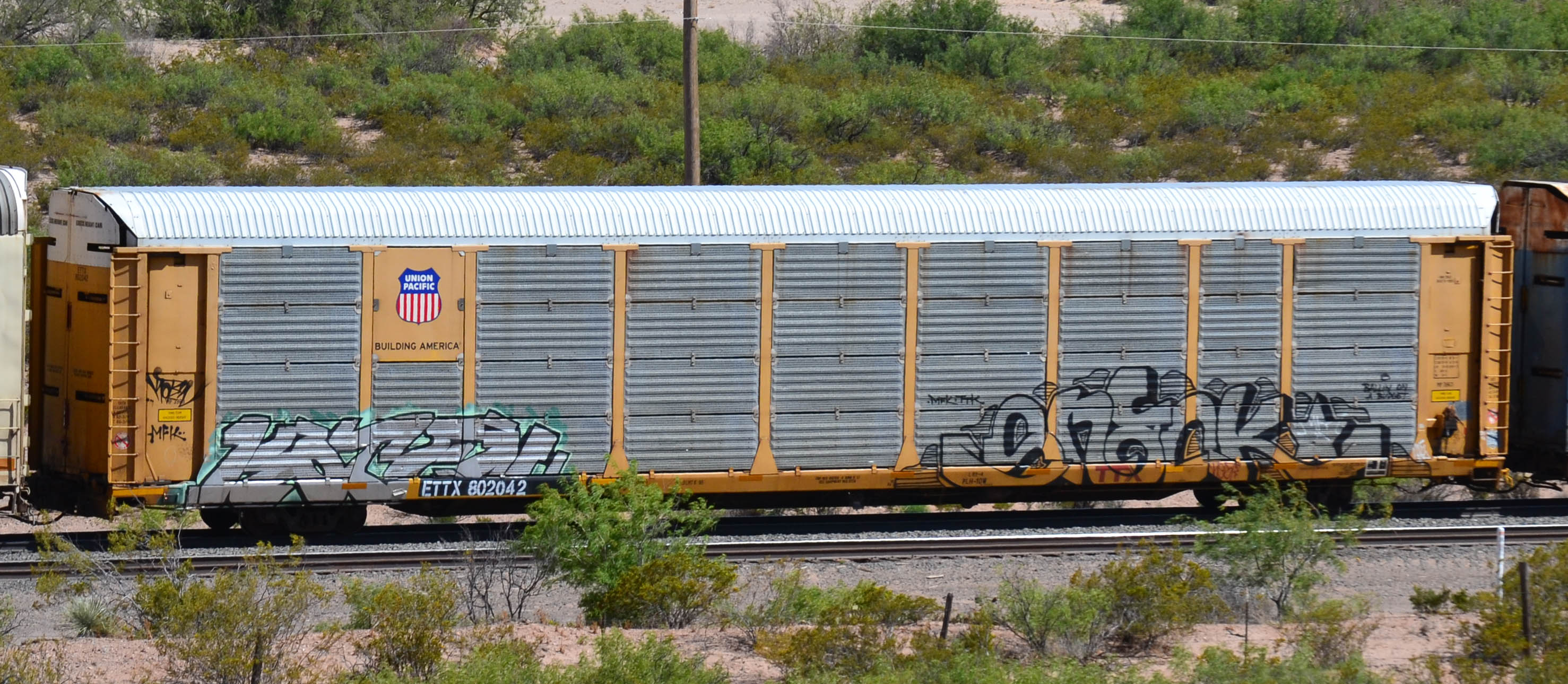 Tri-level MP rack on ETTX 802042. Note that the graffiti necessitated re-stenciling the car’s reporting mark and number. Northbound NAFTA train at Rincon, 5/08/2016. |