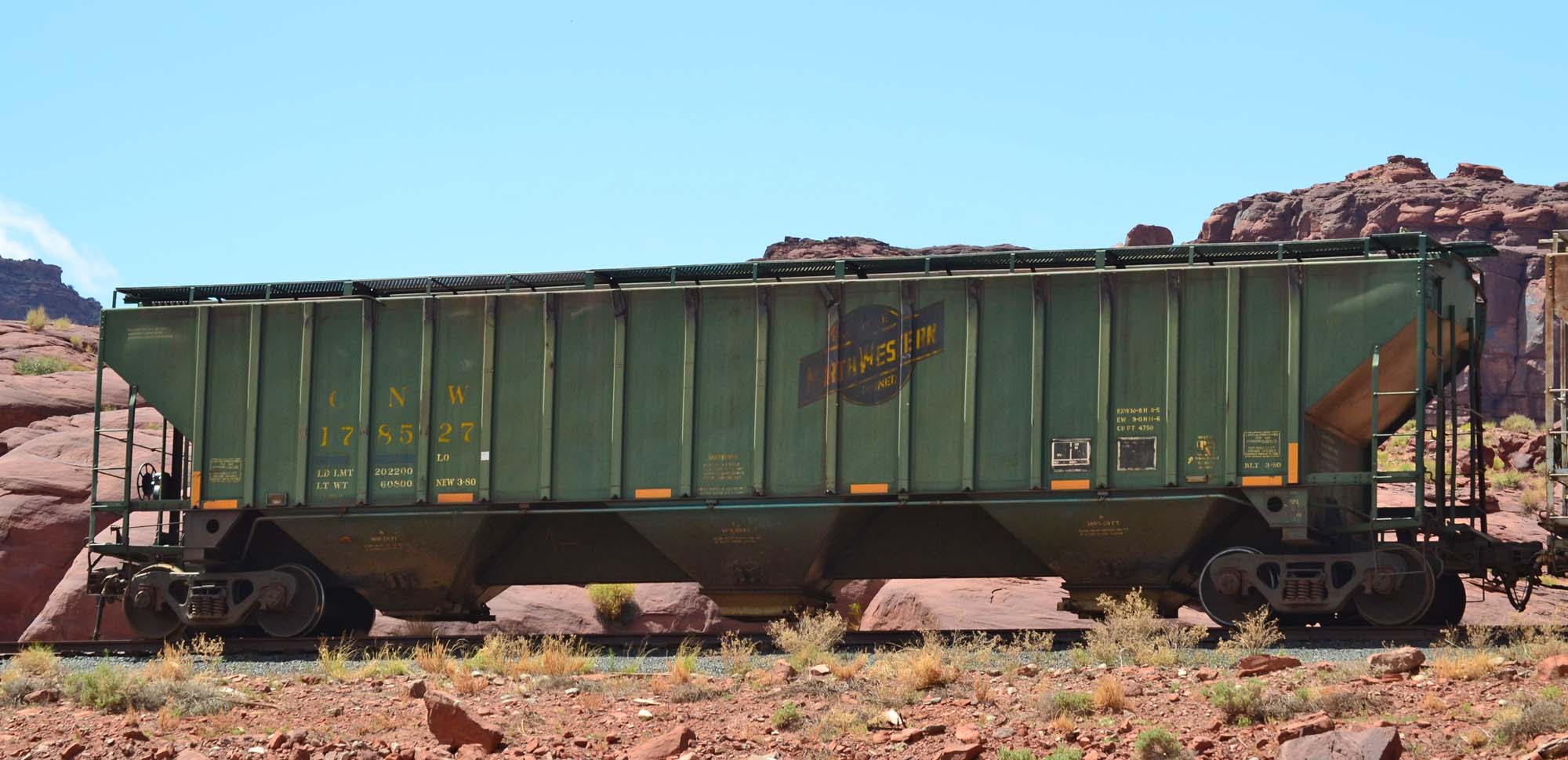CNW 4750 cu ft hopper 178527, built by Pullman-Standard in March 1980. Other than the herald, the paint’s in pretty good shape for a 34-year-old car. At Moab Salt on 4/28/2014. |