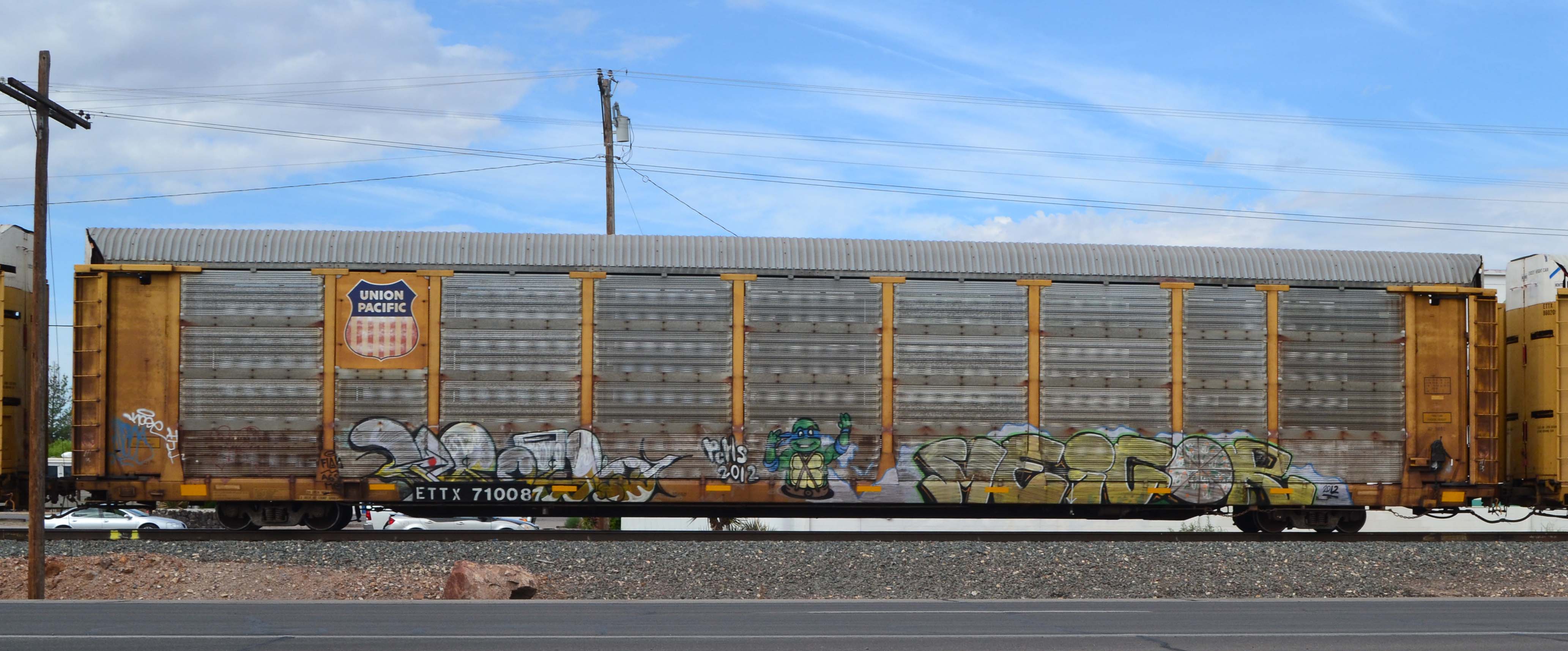 Tri-level MP rack on ETTX 710087. Another case where graffiti necessitated re-stenciling the car’s reporting mark and number. Check out the Ninja Turtle artwork… Southbound NAFTA train at Las Cruces, 8/03/2015. |