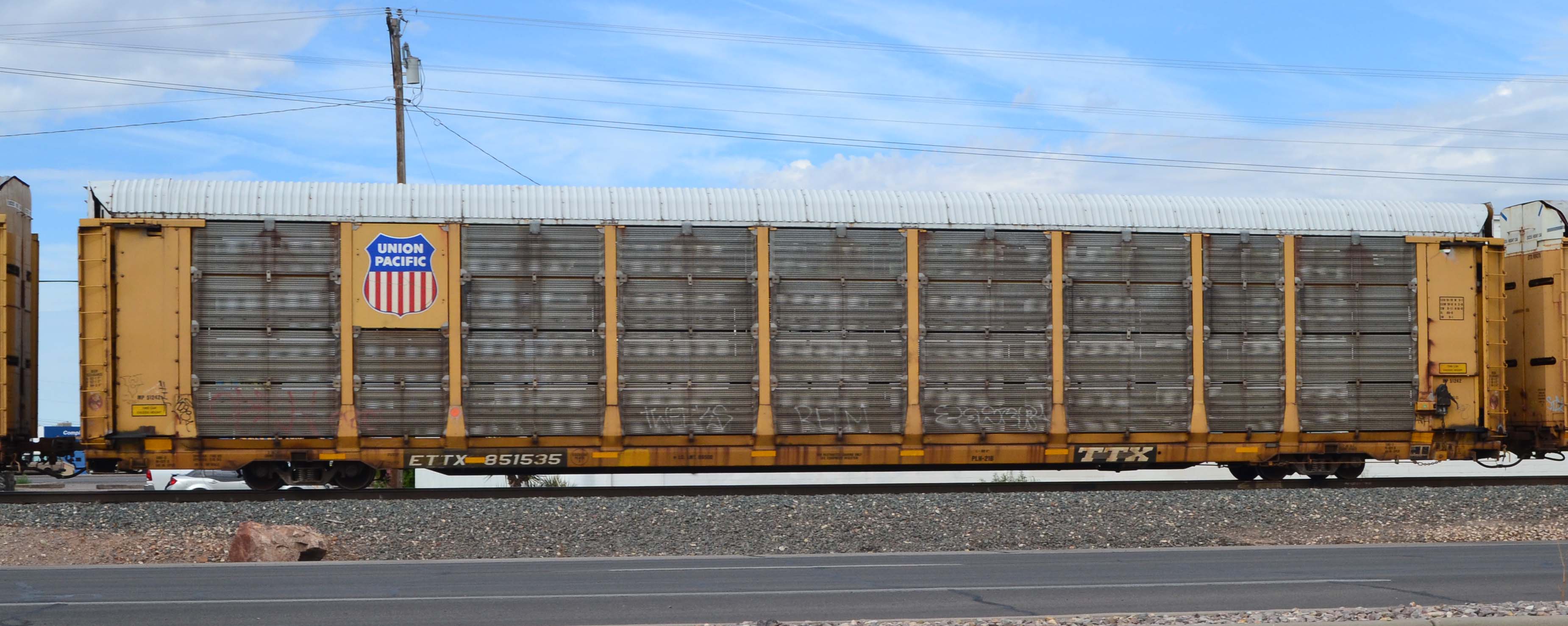 Nice new tri-level MP rack on ETTX 851535. Southbound NAFTA train at Las Cruces, 8/03/2015. |