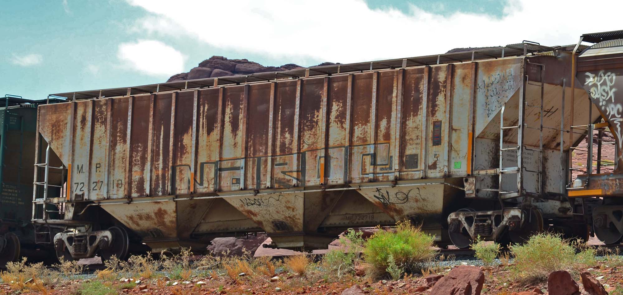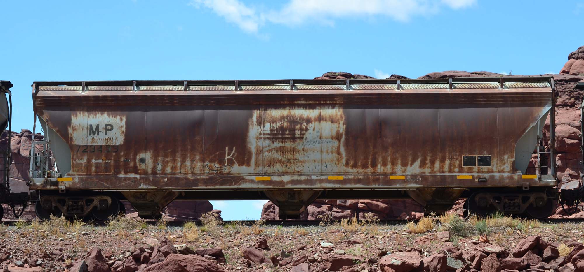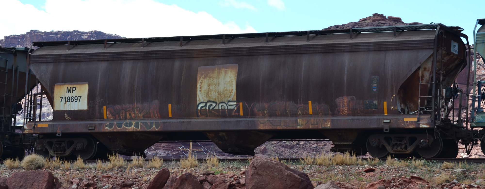 MP three-bay car 718967, by ACF. The whole car is covered with some kind of corruption, although the numbers and the original “buzz-saw” herald have been exposed. At Moab Salt on 4/28/2014. |