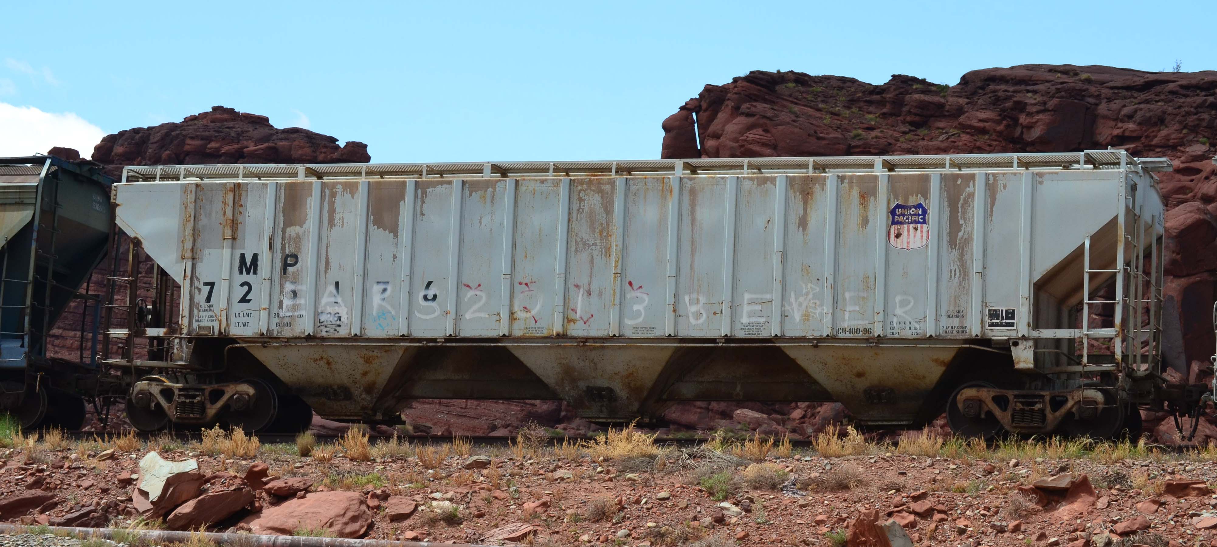 MP three-bay car 723176. Repainted post-merger with a UP herald applied but still carrying its MP marks. At Moab Salt on 4/28/2014. |