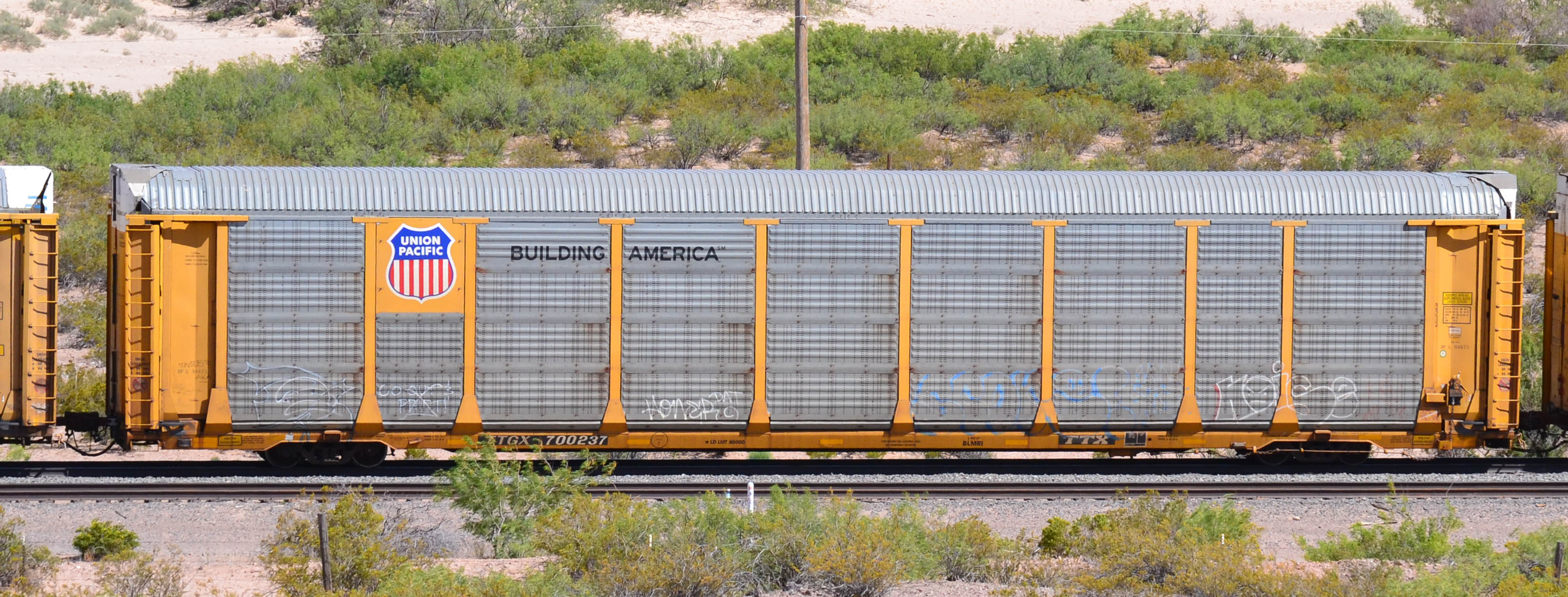 Tri-level rack on TTGX 700237, on a northbound NAFTA train at Rincon, NM (5/08/2016). “Building America” slogan painted on the panels adjacent to the herald. |