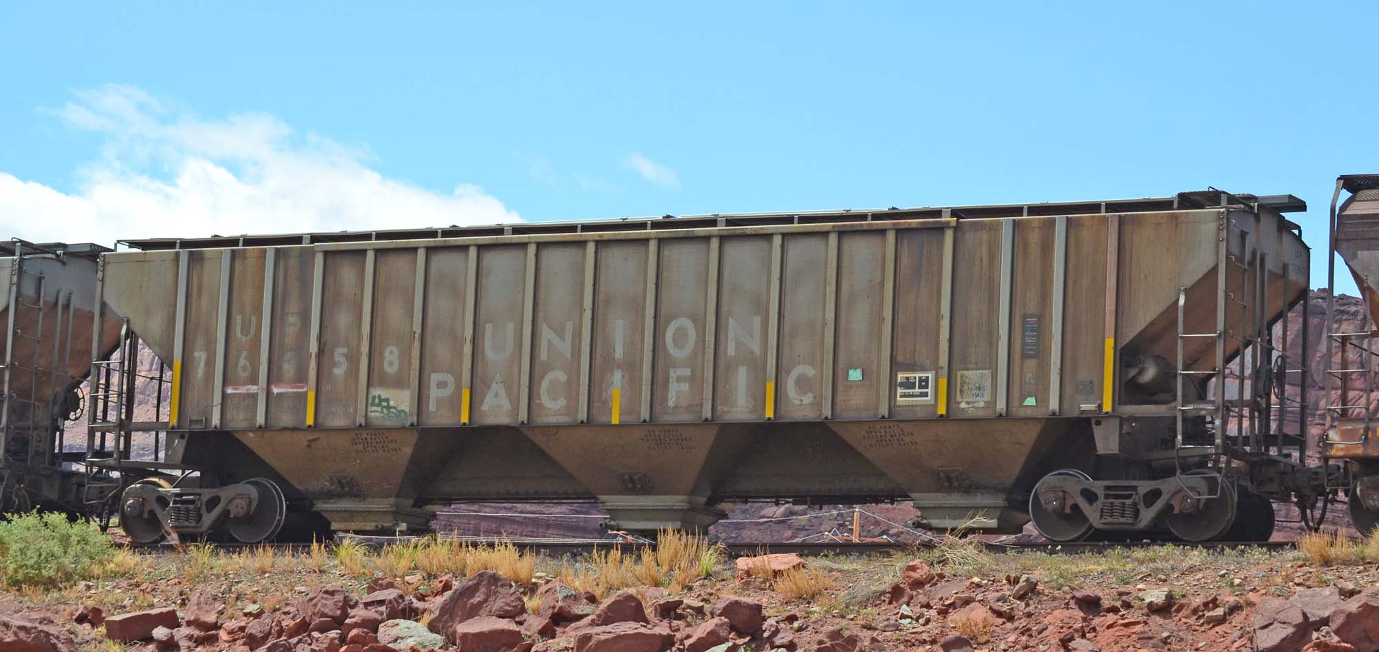 UP three-bay car 76958, possibly Trinity built, seen at Moab Salt on 4/28/2014. All the lettering has faded down to the underpaint. |